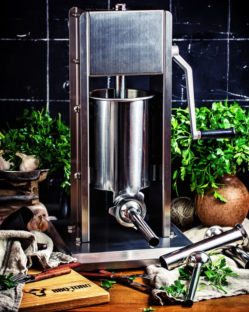 Die, aus hochwertigem Edelstahl gefertigte, Wurstfüllmaschine hat einen ca. 7 Liter Volumen großen Zylinder, welchen Sie mit der Wurstmasse befüllen können.